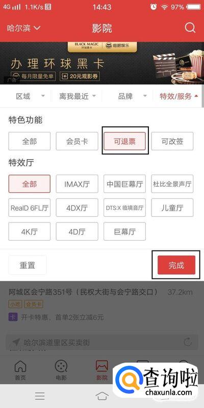 进入影院后,在检索范围中的特效/服务里选择可退票,点击确定,然后在搜索出可以退票改签的影院里,购买影票,如图所示
