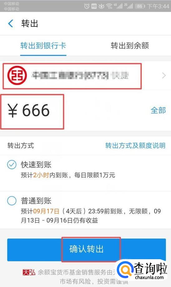 之后我们选择转出到的银行卡,然后输入金额,之后我们点击确认转出就可以了。之后很快钱就会到账了。