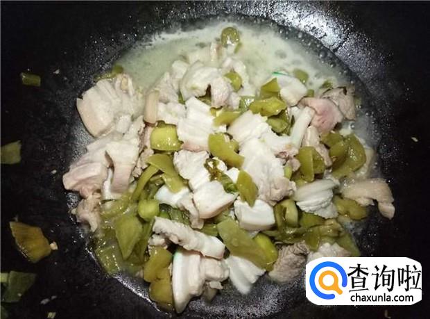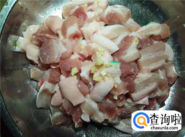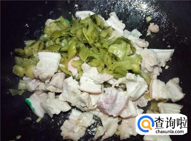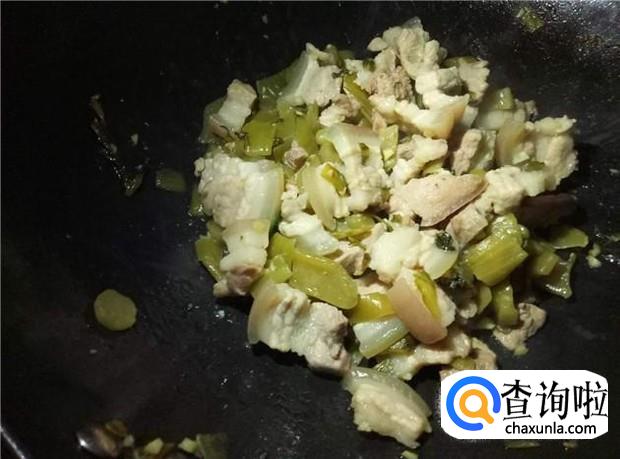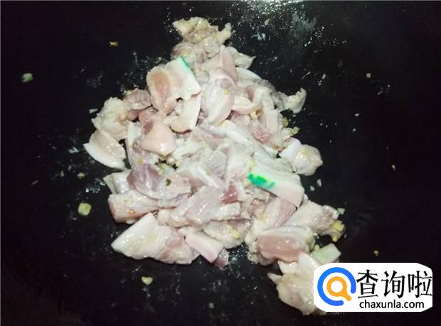 倒入五花肉,一直翻炒,先把水分给炒干,最好能炸出一点油。
