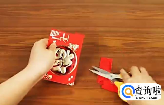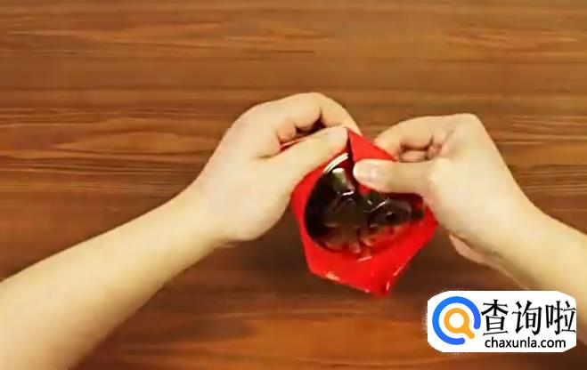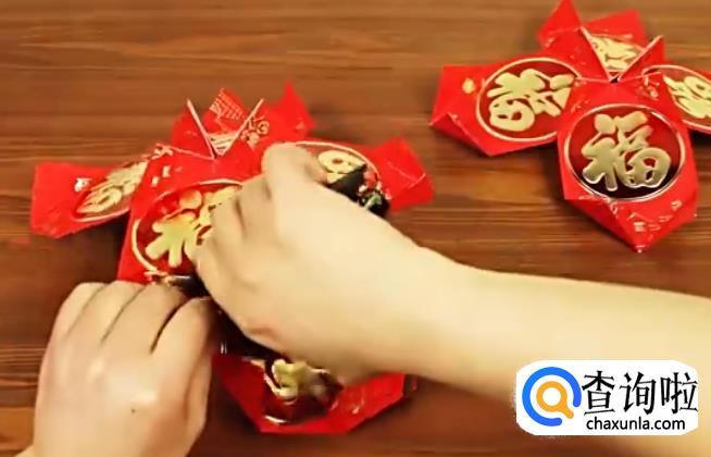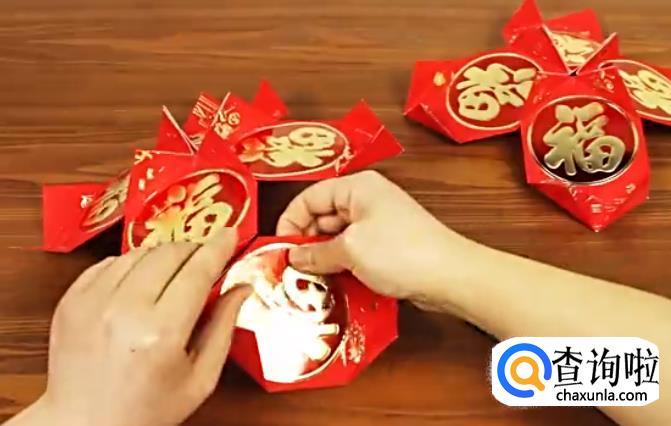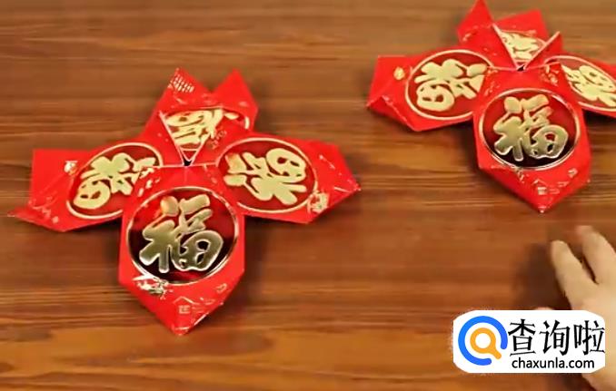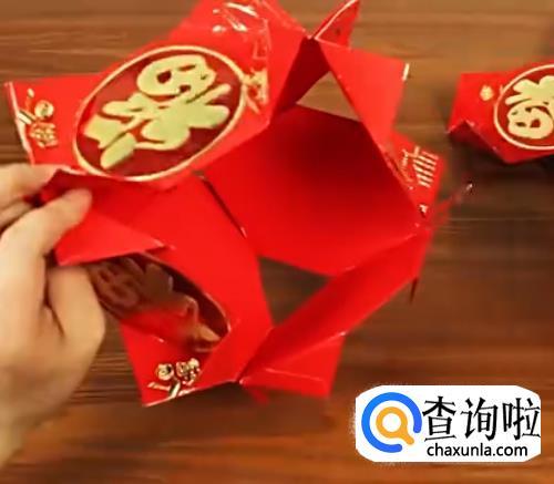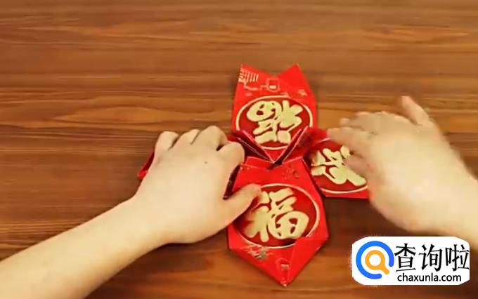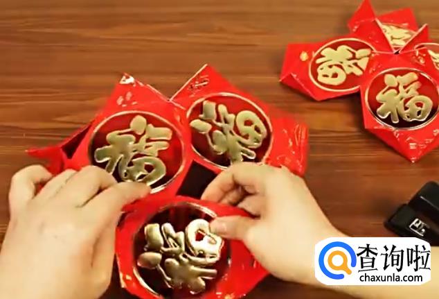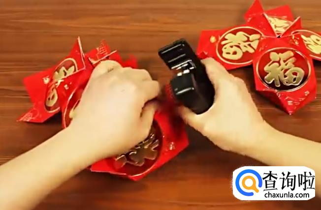 将4个红包摆在一起,然后用订书机将相邻的两个褶起来的角订在一起。