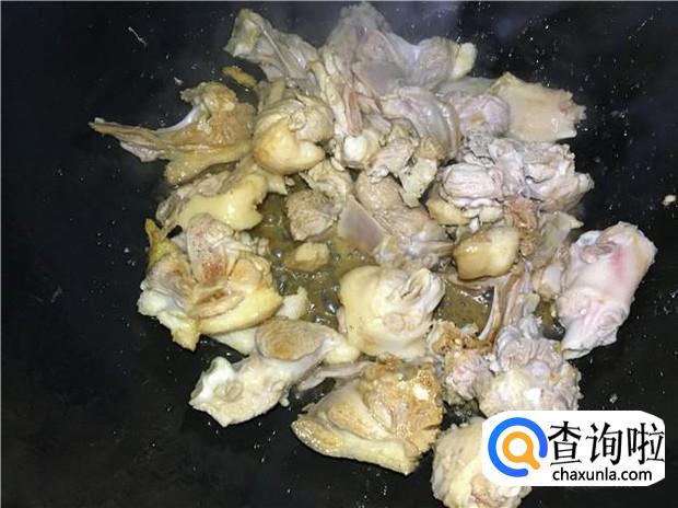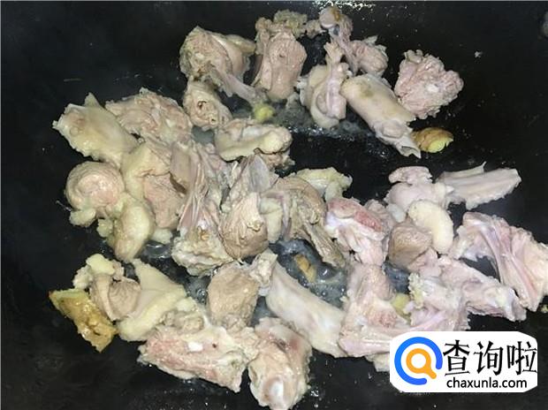 热锅下油,放入姜片煸香,然后倒入鸭肉,翻炒均匀。