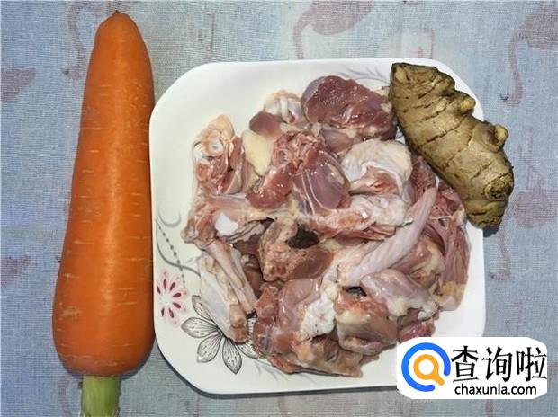 所有原材料准备好,新鲜的鸭肉半边、红萝卜一根、老姜一块。