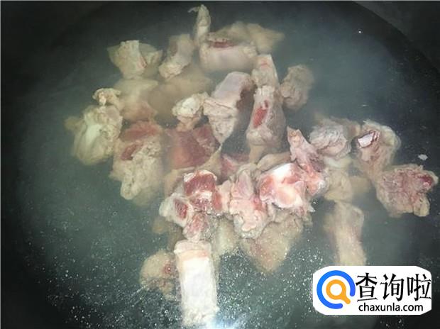 锅里提前把半锅水烧开,水沸腾后,把排骨倒入锅中,烫几分钟,去掉血水,再捞起来,沥干水分,备用。