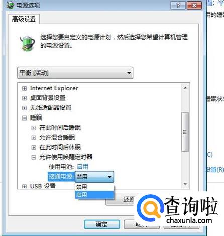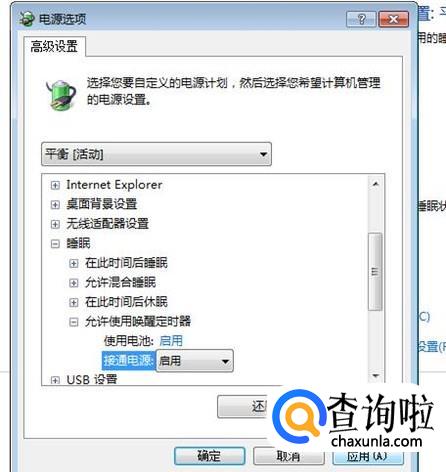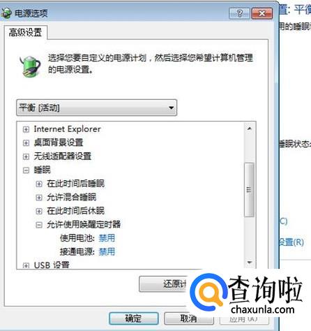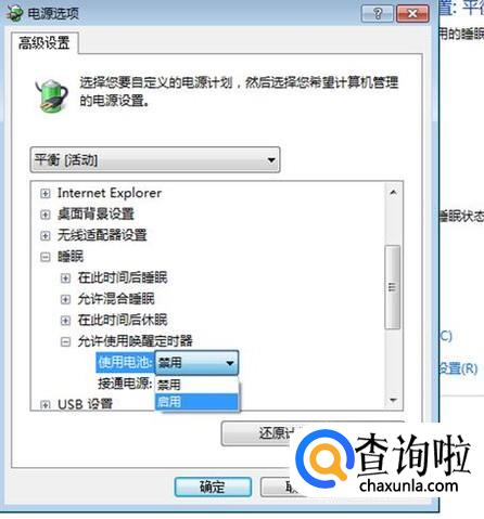 在中间的列表里点一下“睡眠”前的加号,在下面出现的列表里点一下“允许使用唤醒定时器”前的加号。