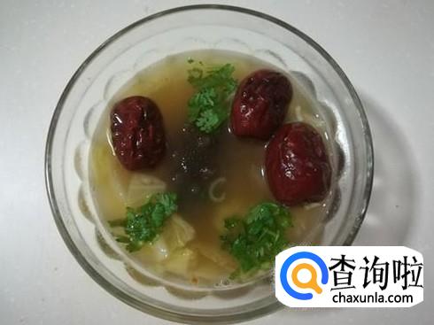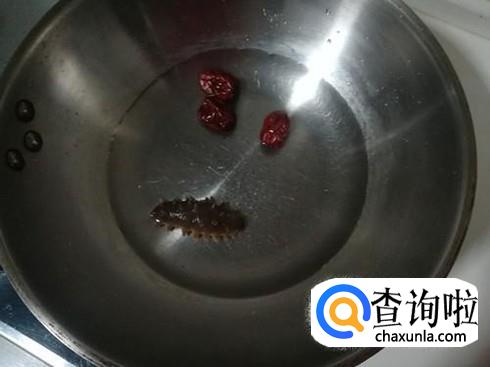 海参1个,红枣3个,猪骨头汤1勺,精白菜,香菜,盐,味极鲜酱油等适量。