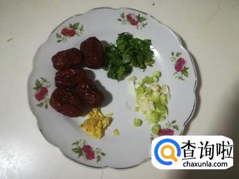 把葱切葱花,姜切成细丝,香菜切成段,红枣洗净。