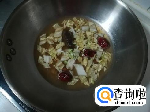 再放入精白菜块,1勺盐,1小勺味极鲜酱油,葱、姜丝,盖上锅盖,调小火炖上20分种即可。