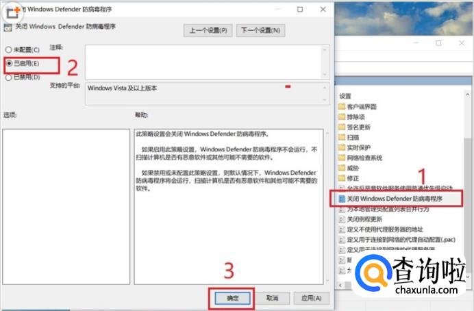 最后双击右侧的“关闭Windows Defender防病毒程序”,然后在打开的关闭设置中,将默认的“未配置”改为“已启用”,然后点击底部的“确定”保存设置即可。