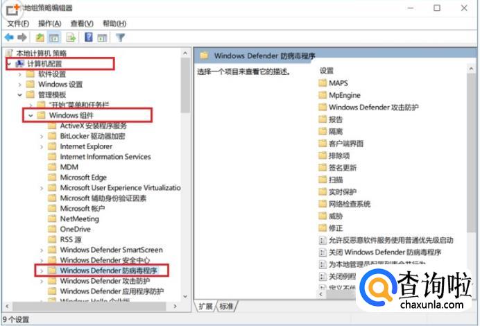 打开Win10组策略编辑器之后,依次点击展开“计算机策略”→“管理模板”→“Windows组件”→“Windows Defender防病毒程序”,如图所示。