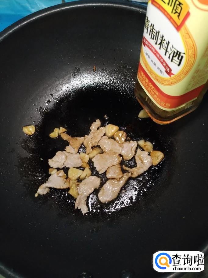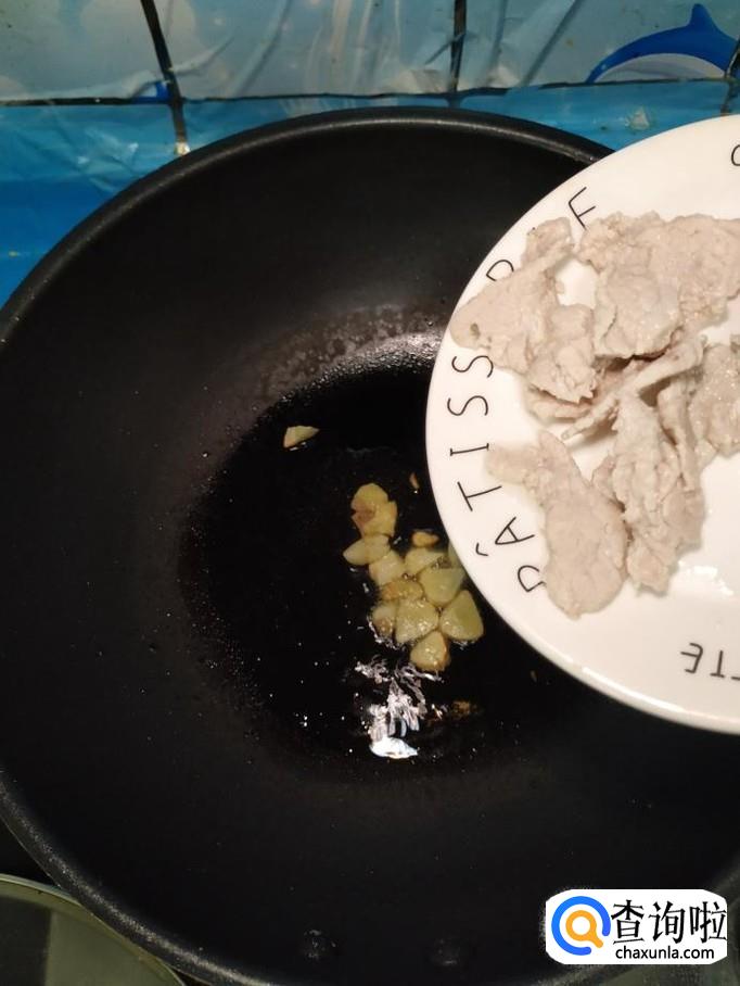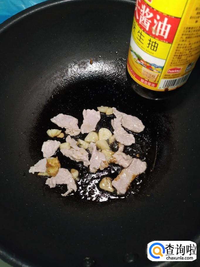 准备适量蒜,剥去外皮,切成片,炒锅中放入适量油,油热后将蒜片放入锅中炒香,然后将猪里脊肉倒入锅中,翻炒均匀。