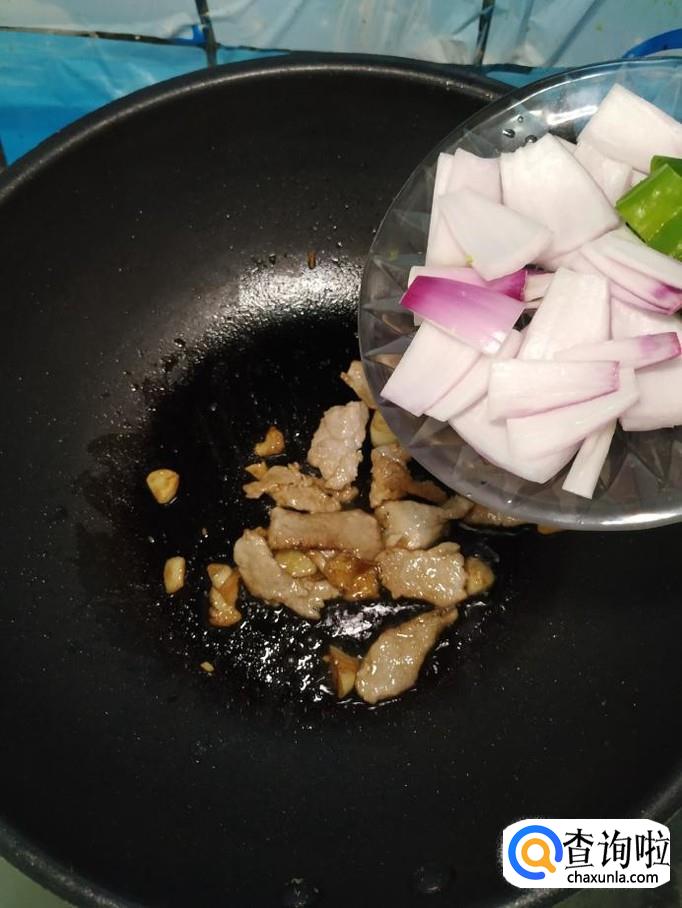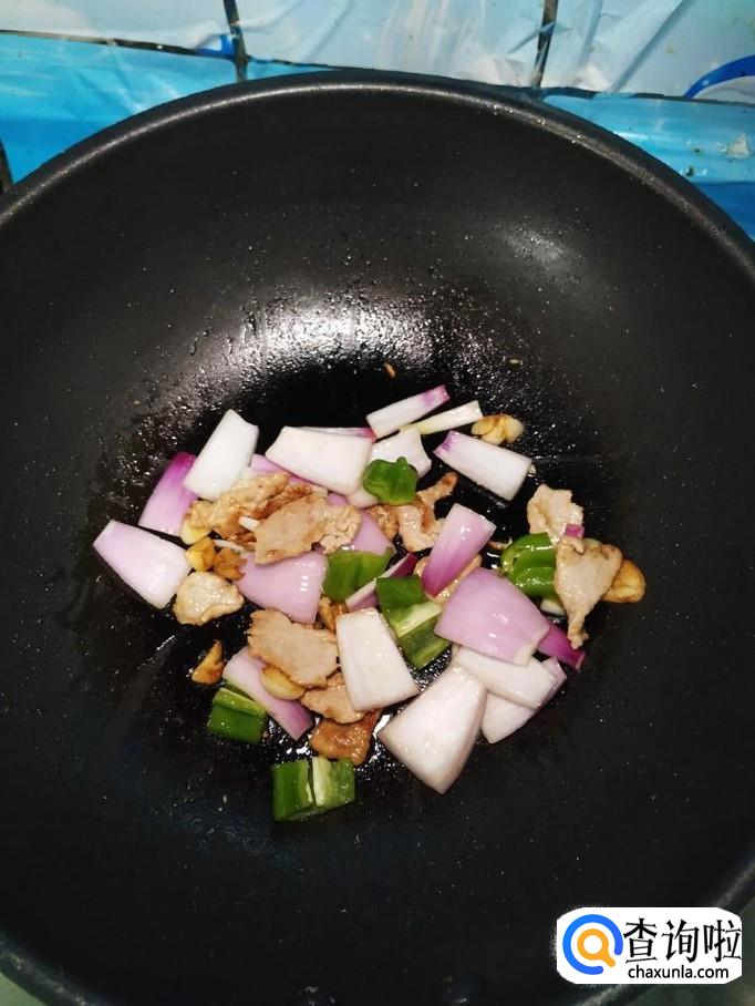 将洋葱和青椒块儿倒入锅中,翻炒均匀。