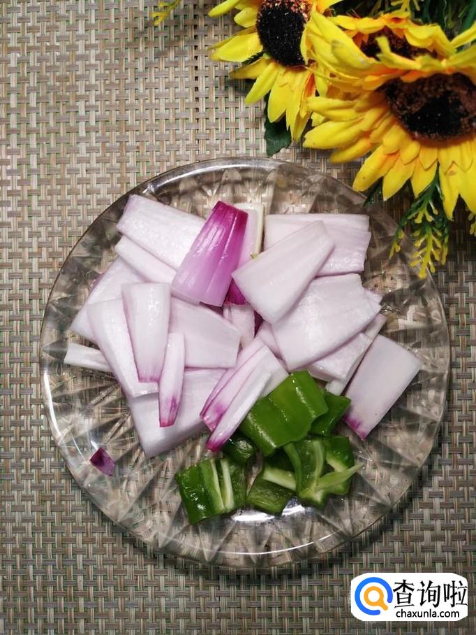准备适量洋葱和青椒,将洋葱洗净后切成片,青椒洗净后,也切成小片,再准备适量平菇,洗净后撕成小朵。