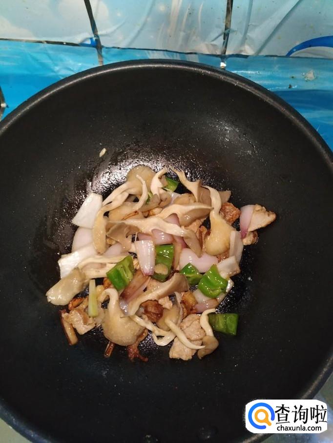 将准备好的平菇也倒入锅中,和洋葱,青椒一起翻炒。