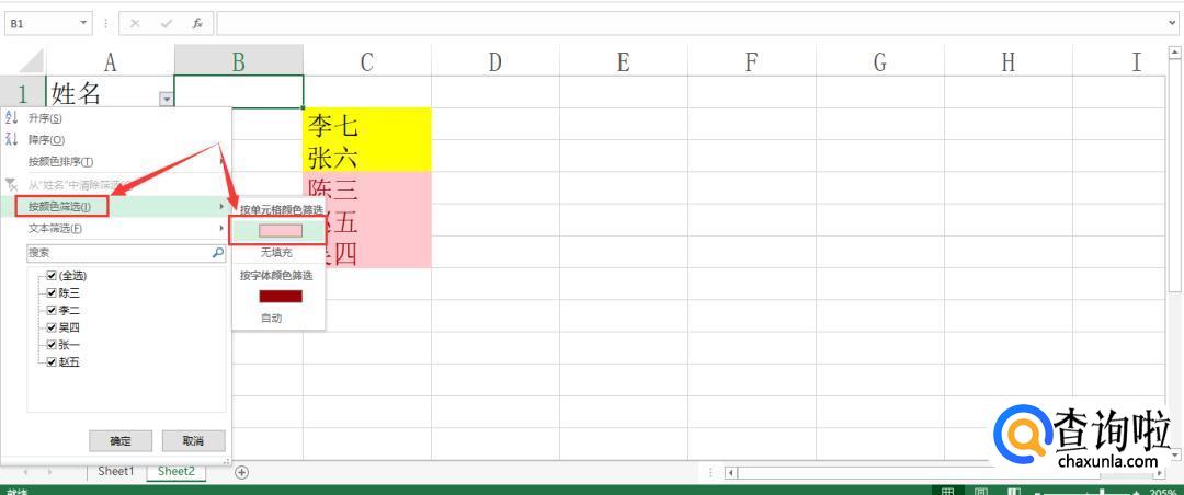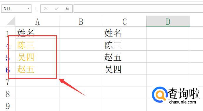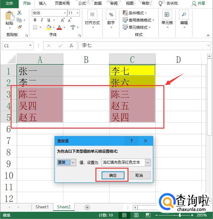 将深红色的单元格筛选出来,就是我们要的重复的姓名了,无颜色填充的就是不同的姓名了。