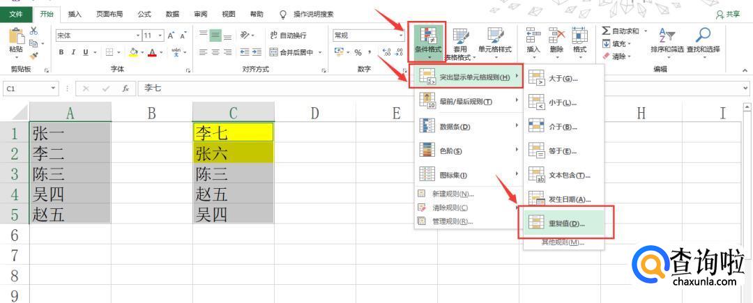 点击【开始】—【条件格式】—【突出显示单元格规则】—【重复值】,在跳出的对话框点【确定】,这时我们就可以看到重复的值变成深红色了。