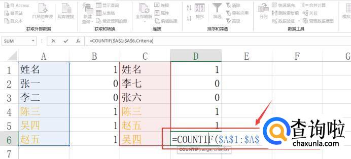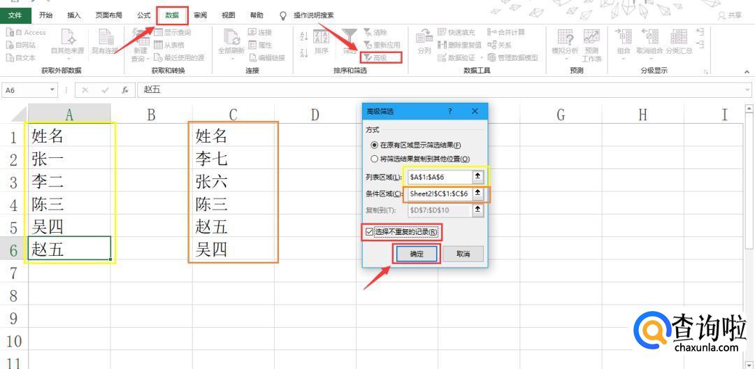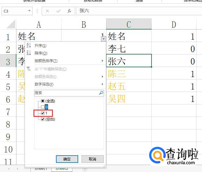 在B列添加【筛选】,把“1”筛选出来,并填充为橙色,同样的方法吧D列“1”筛选出来填充橙色,即为重复姓名,无填充的颜色即为不重复的名字。