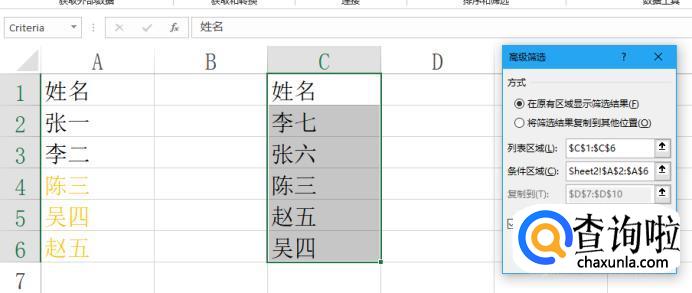 首先选择A列,点击【数据】—【筛选】—【高级】,在【高级筛】选对话框中,【条件区域】选择C列,勾选“选择不重复的记录”点击【确定】。