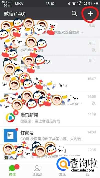 然后,在微信页面点击右上角的加号。