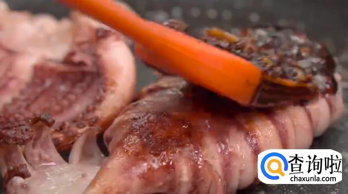之后锅中热油,煎鱿鱼。接着转中小火,双面都刷上酱汁。