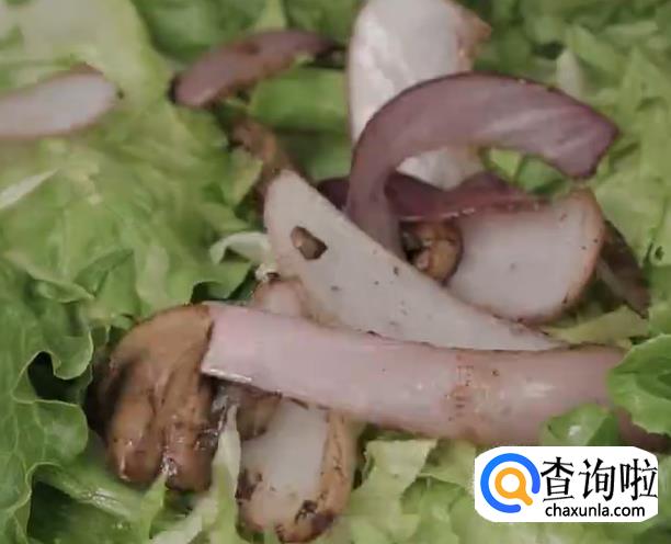 锅中热油,煎香蘑菇、洋葱,黑胡椒和盐调味后倒入餐盘中。