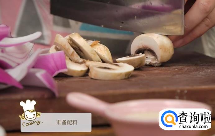 首先切洋葱、蘑菇,鱿鱼切花,控干水分待用、