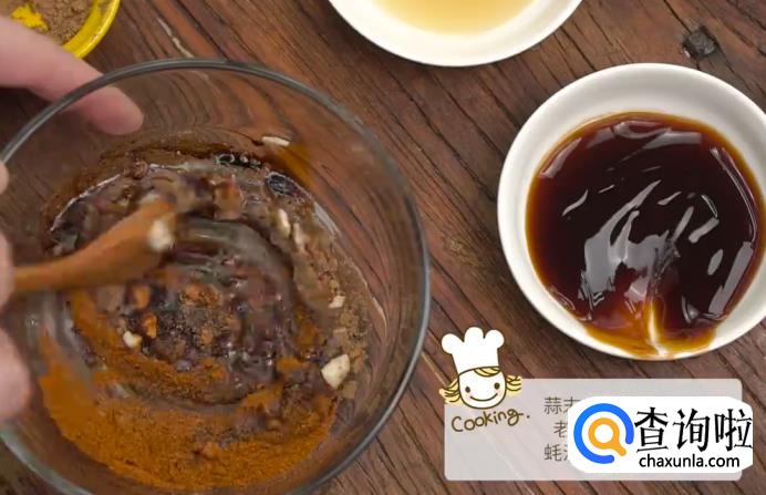 之后把蒜末、五香粉、辣椒粉、老抽、香油、烧烤酱、蚝油、蜂蜜搅拌均匀,调配成酱汁。