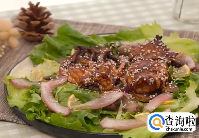鱿鱼、生菜、洋葱、蘑菇、大蒜 2瓣、五香粉 1克、辣椒粉 2克、老抽 3克、香油 5克、烧烤酱 10克、蚝油 5克、蜂蜜 15克、黑胡椒、盐、白芝麻
