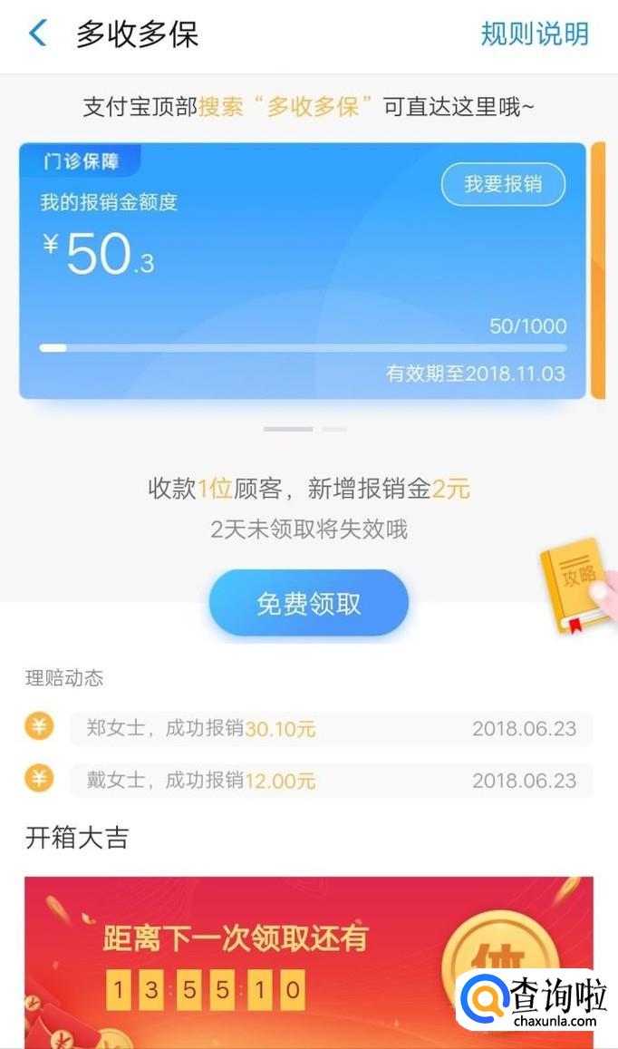 在这可以看到我的门诊报销金。每个人额度都是1000元,我目前报销金额度50元。每天收款都可以积累报销金。另外也可以通过每日开启 开箱大吉获得不等数量的报销金。最多的1元,一般都是0.5元!