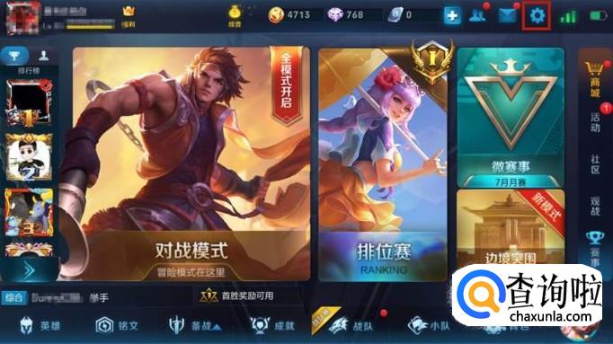 首先点击王者荣耀主界面上方的设置按钮,如下图所示。