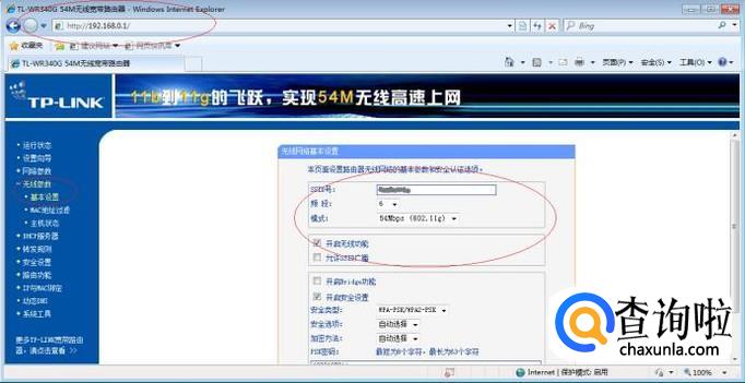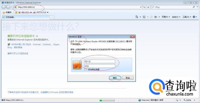 唤出"Internet Explorer"程序窗口,如图所示。地址栏输入无线路由器WEB管理地址,唤出登录页面输入用户名和密码。
