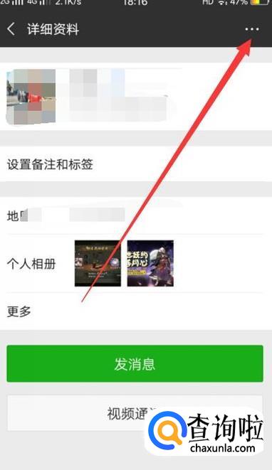 进入到联系人详情页面之后,点击图示位置的三个小白点,如图所示。
